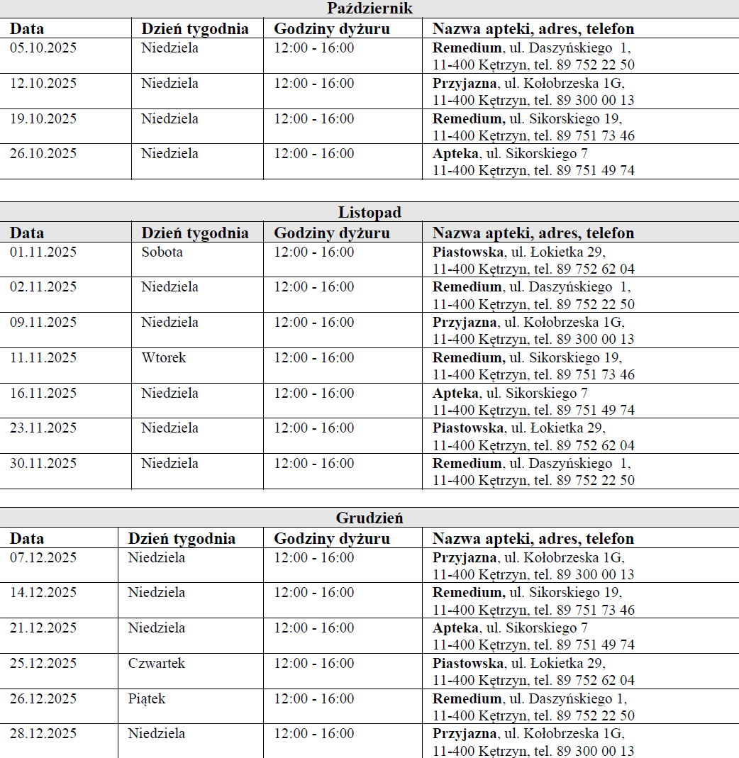 Najbliższa apteka pełniąca dyżury w ograniczonym czasie: Apteka Przyjazna, ul. Tadeusza Kościuszki 25A i 25B, Giżycko: od poniedziałku do piątku do godz. 23:00, w soboty i niedziele w godz. 20:00-22:00, w święta w godz. 14:00-21:00